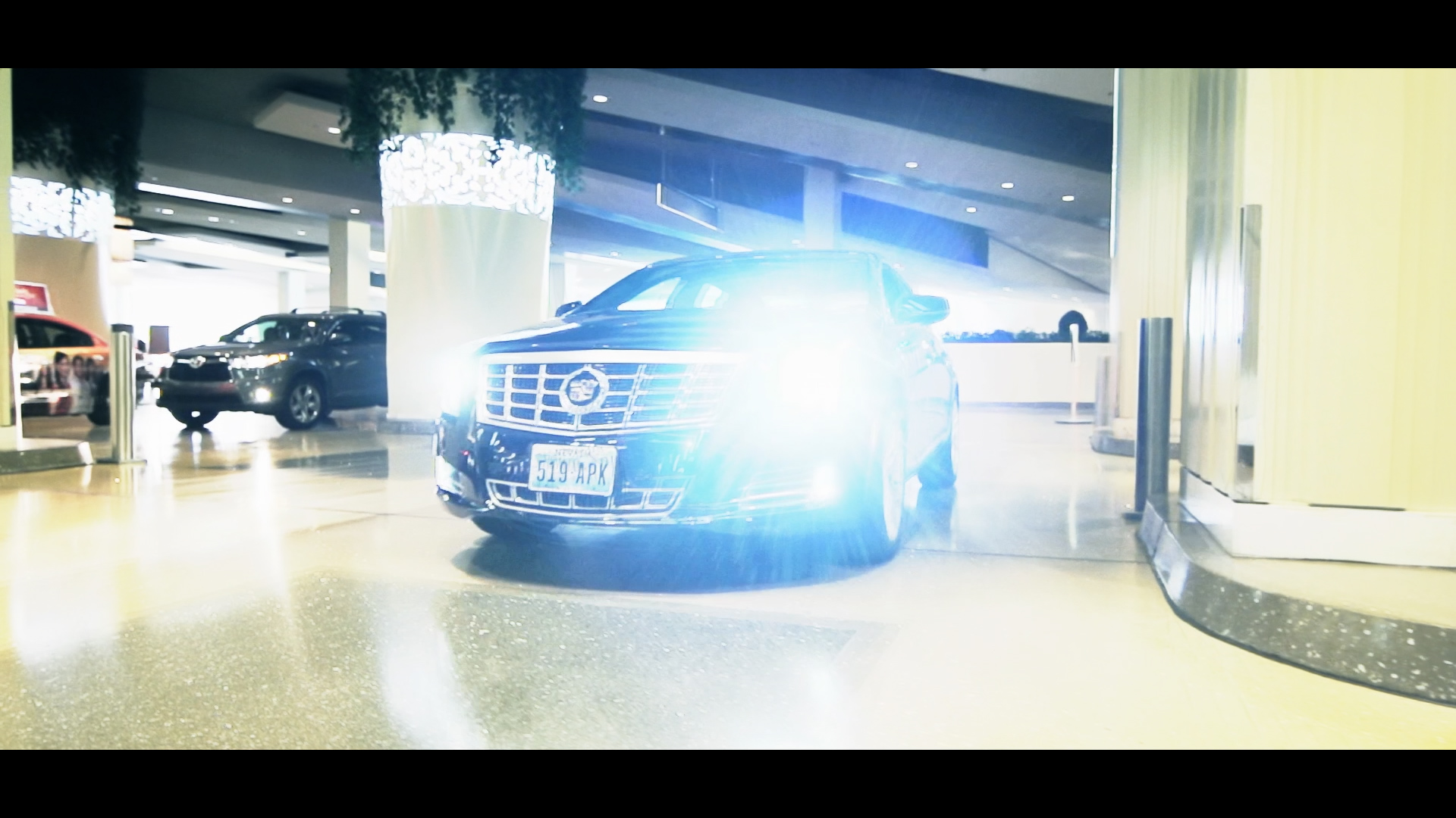 For the car shot, I told the driver to come straight at the camera while I moved around them—trusting I’d get out of the way in time. I wanted a dynamic move that started low, rose as the car approached, passed over the hood, and landed back down on the headlight. We shot this at 240 fps, likely on a 14mm lens. For the lobby scene, my height (I’m 6'8") worked to my advantage. With my arm raised, I could get nearly 9 feet of elevation for those sweeping gimbal movements.
